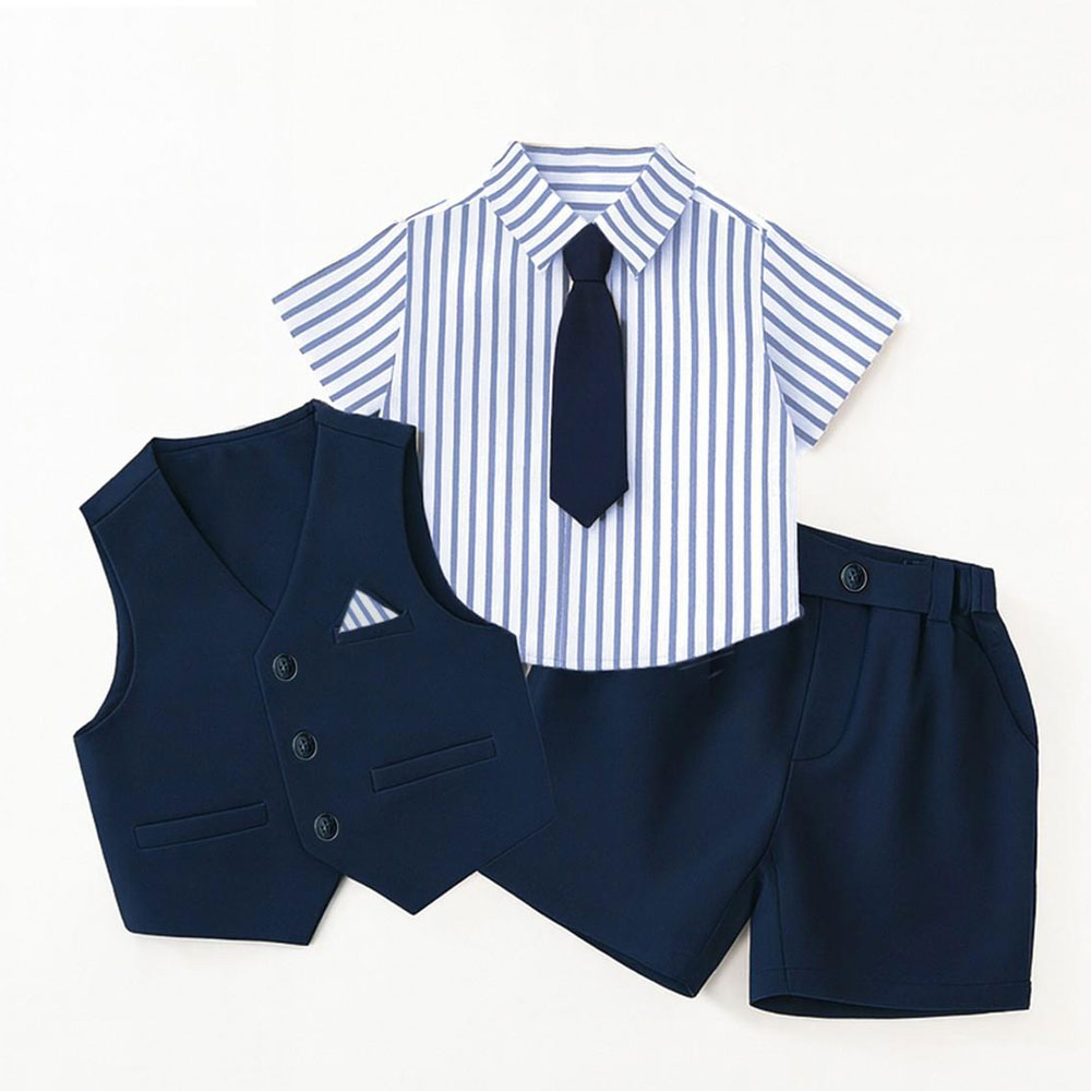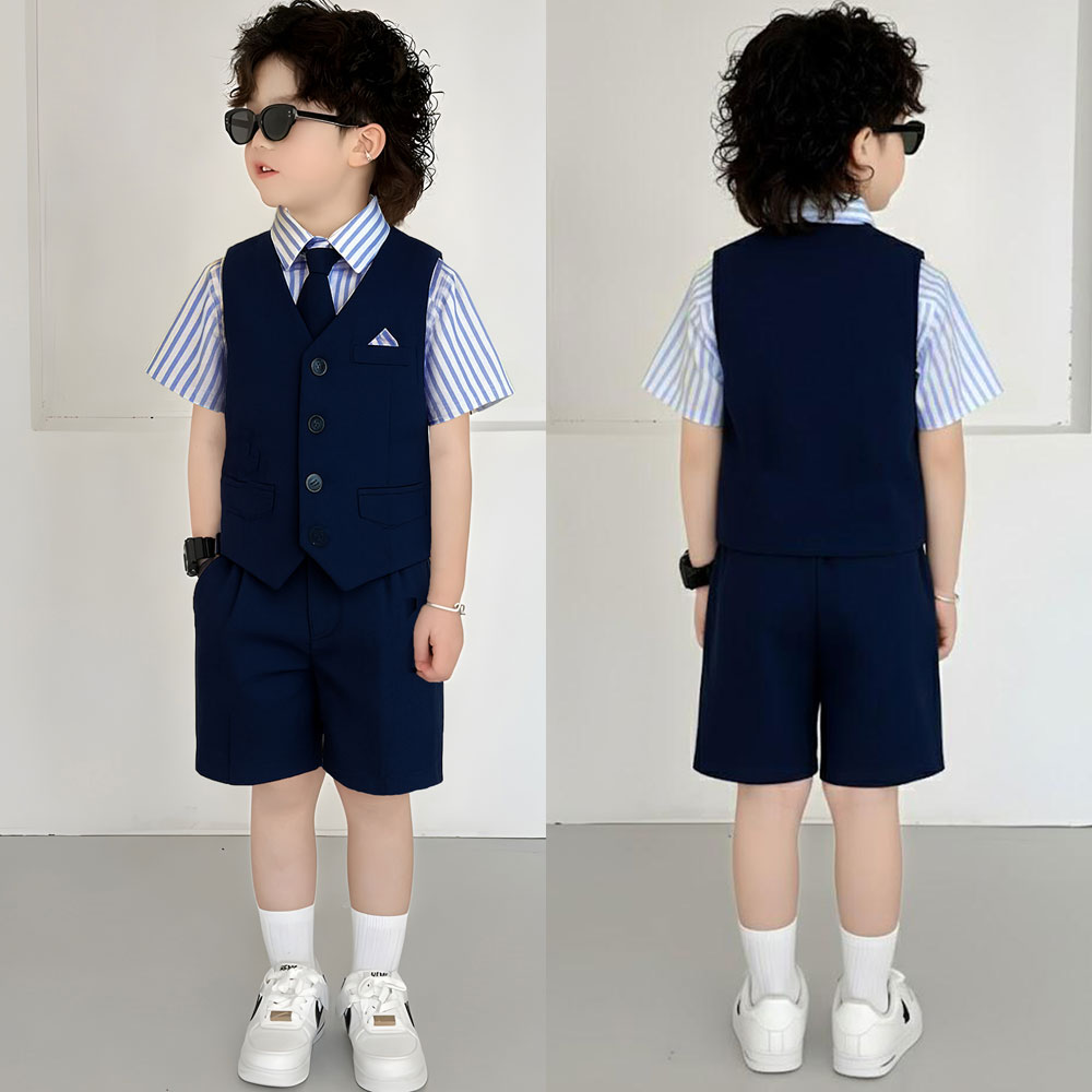[10kg-32kg] Set bộ bốn món sơ mi quần short áo ghi lê và cà vạt màu xanh