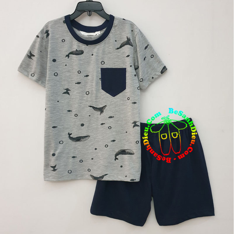 Đồ bộ mặc nhà cho bé trai vải thun mỏng mát hàng VN từ 20kg đến 24kg màu xám in cá