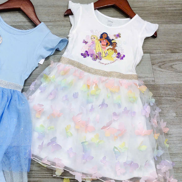 Đầm thun phối voan in hình các nhân vật hoạt hình Disney cho bé gái, vừa xinh xắn, rực rỡ lại mát rượi, nhẹ tênh, bé có thể tung tăng trong chiếc áo đẹp cả ngày mà vẫn thoải mái.