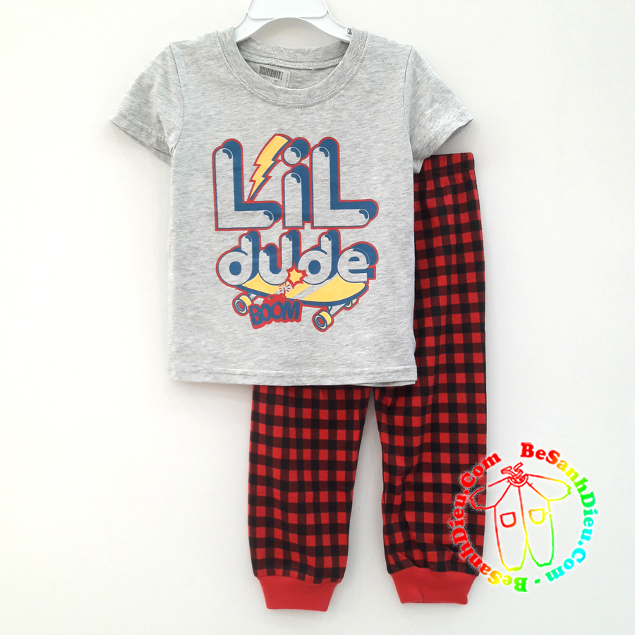 Đồ bộ thun tay ngắn quần dài cho b é hiệu Geejay từ 10kg đến 12kg áo xám quần caro đỏ