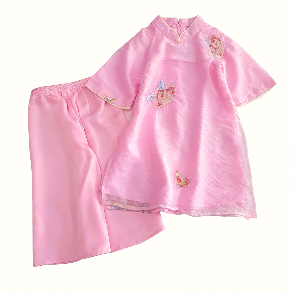 [8kg-38kg] Bộ áo dài bé gái vải tơ thêu hoa màu hồng phấn