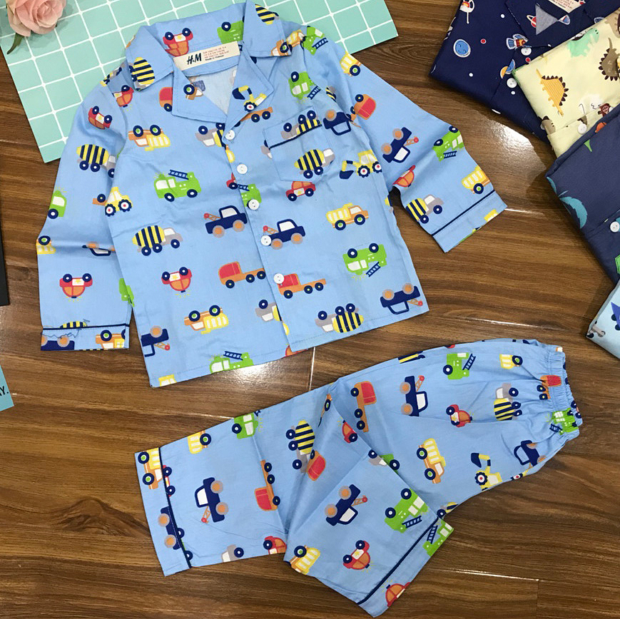 Đồ bộ pyjama vải cotton mềm cho bé trai từ 8kg đến 10kg màu xanh in xe